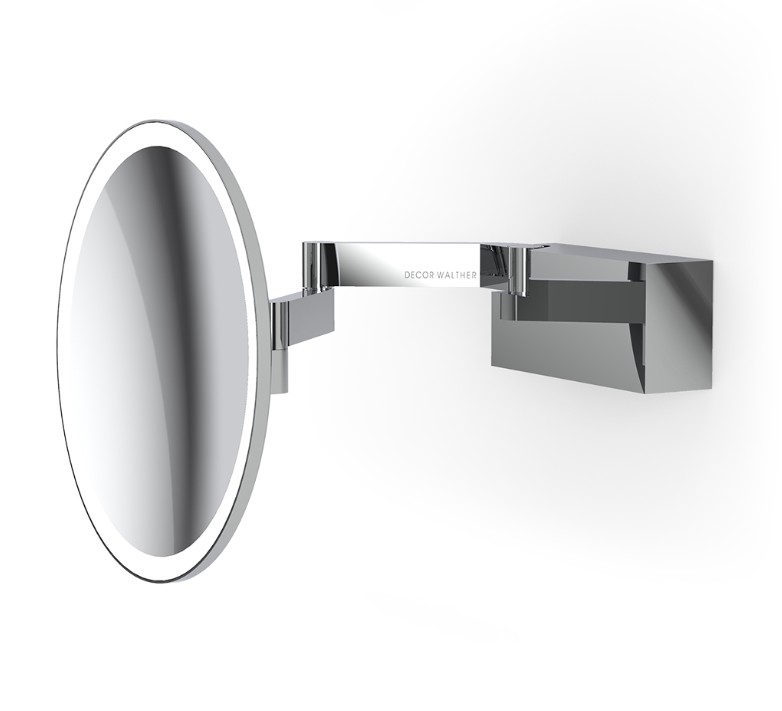 Decor Walther make up-scheerspiegel Vision met verlichting. Moderne, strakke scheerspiegel die 5x vergroot. De doorsnede van de spiegel is 20cm en als deze ingeklapt is, is deze strak tegen de muur dit geeft een cleane uitstraling. Deze spiegel wordt direct op het lichtnet aangesloten.