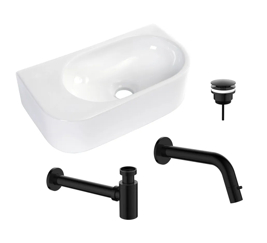 Regn fonteinset compleet met kraan, sifon en plug. Glanzend wit van keramiek gemaakt fontein met afgeronde hoeken zonder kraangat. De wandkraan is ter plaatse inkortbaar naar wens. Alle accessoires zijn uitgevoerd in de afwerking gunmetal black. De fontein heeft een afmeting van 40×21,5cm.