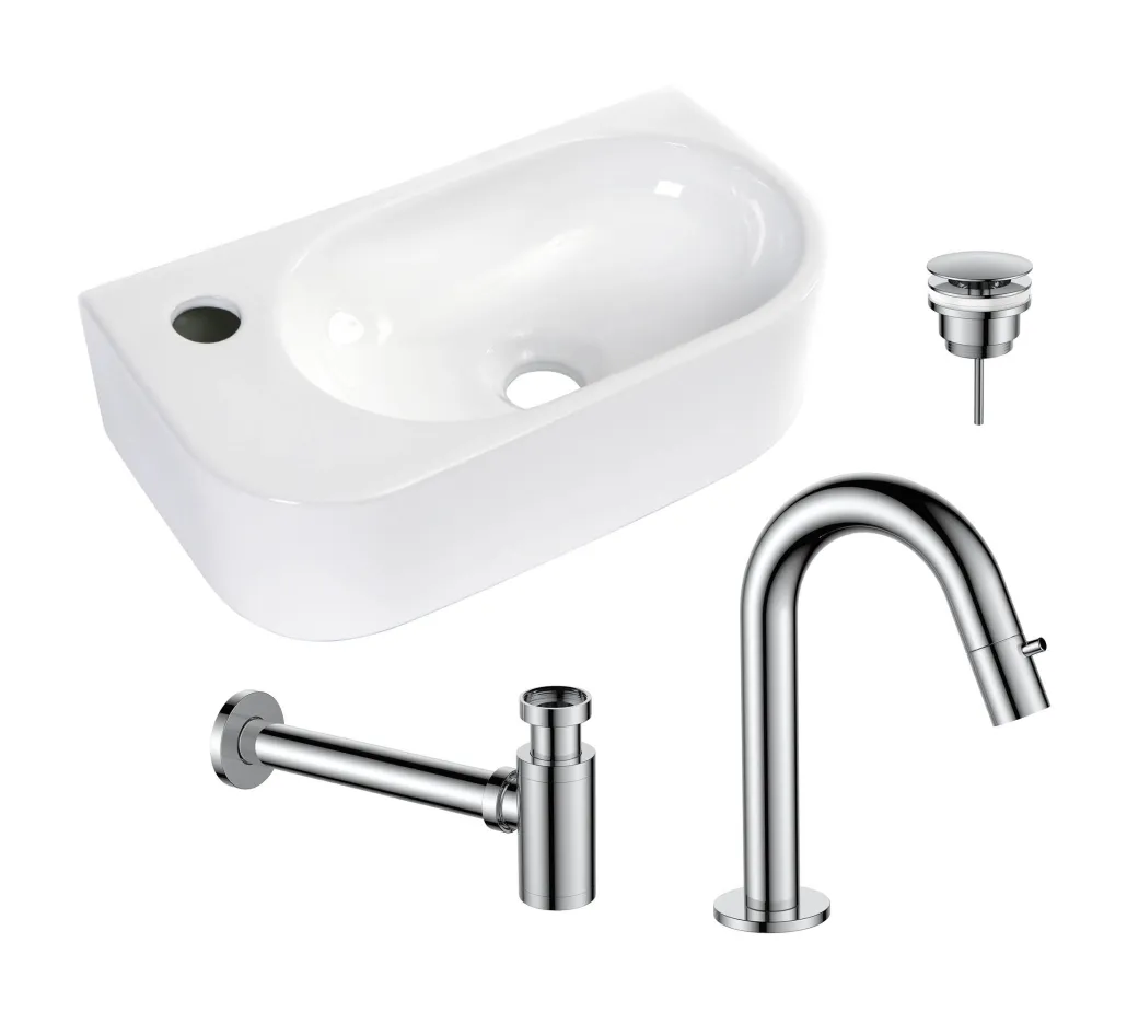 Regn fonteinset compleet met kraan, sifon en plug. Glanzend wit van keramiek gemaakt fontein met afgeronde hoeken zonder kraangat. Alle accessoires zijn uitgevoerd in de afwerking glanzend chroom. De fontein heeft een afmeting van 40×21,5cm. (LET OP! Afbeelding is van een links model!)
