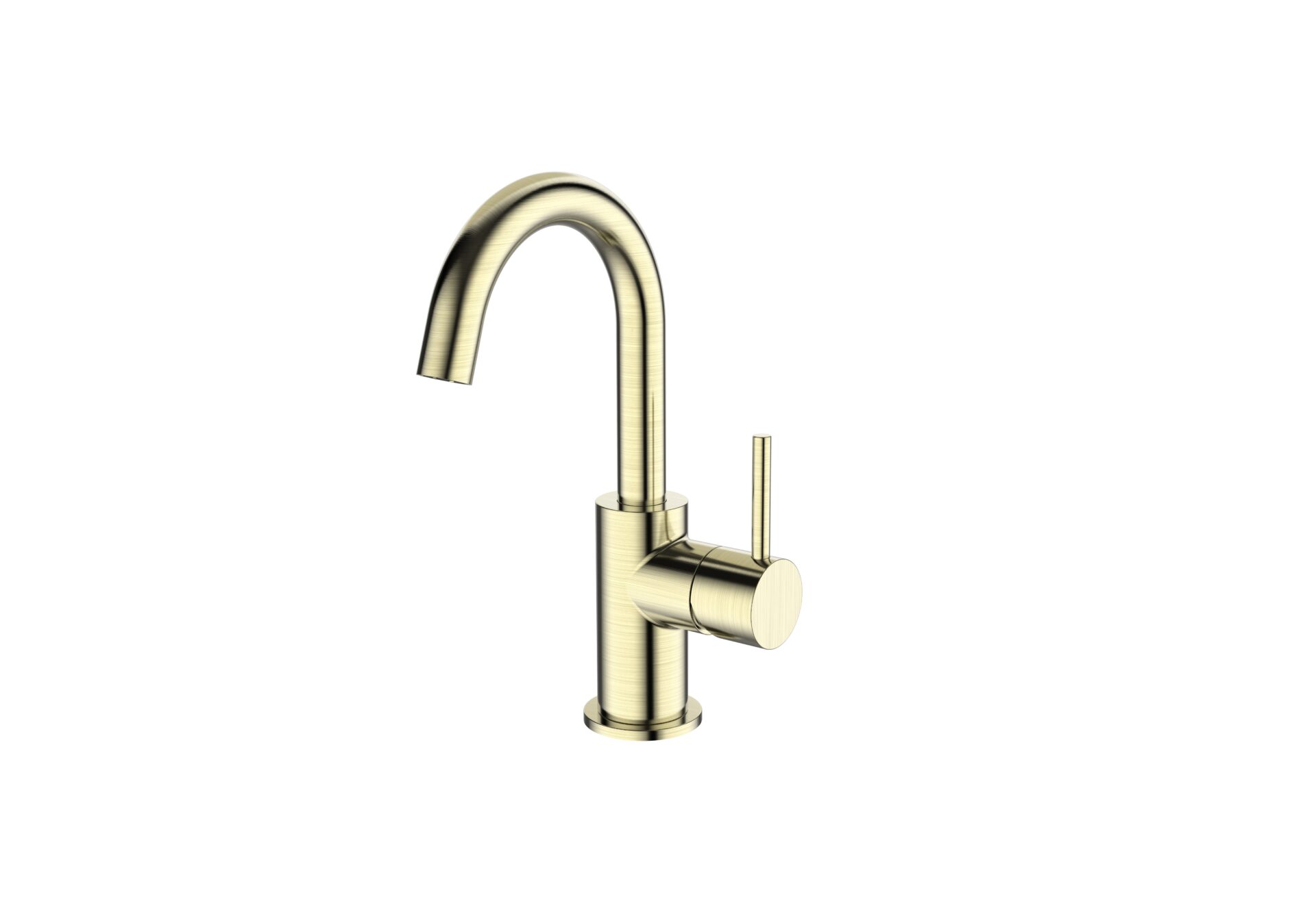 Regn coldstart wastafelkraan gebogen champagne 10003CH. Regn, Deens design met uitstekende kwaliteit en vormgeving. Deze kraan is PVD gecoat en hierdoor zuur- en krasbestendig. Deze kraan is mooi te combineren met de plug en designsifon van Regn in dezelfde kleurstelling, geborsteld champagne.