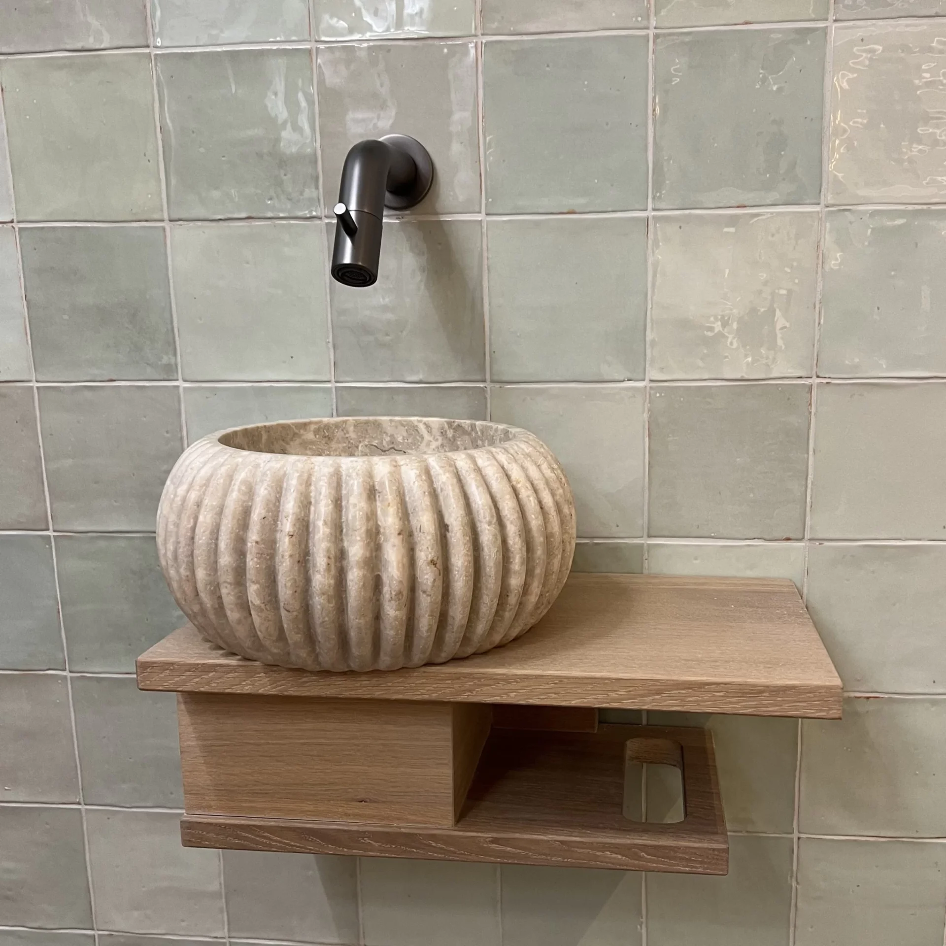 Loutro Agora Mini opzet wastafel. Kleine ronde wastafel van geribbeld marmer in zand tinten. De buitenkant met reliëf geeft een zeer speciaal effect! De tint kan afwijken van de foto omdat het een natuurproduct is. Deze wastafel is door zijn formaat ook zeer goed in een toilet te gebruiken!